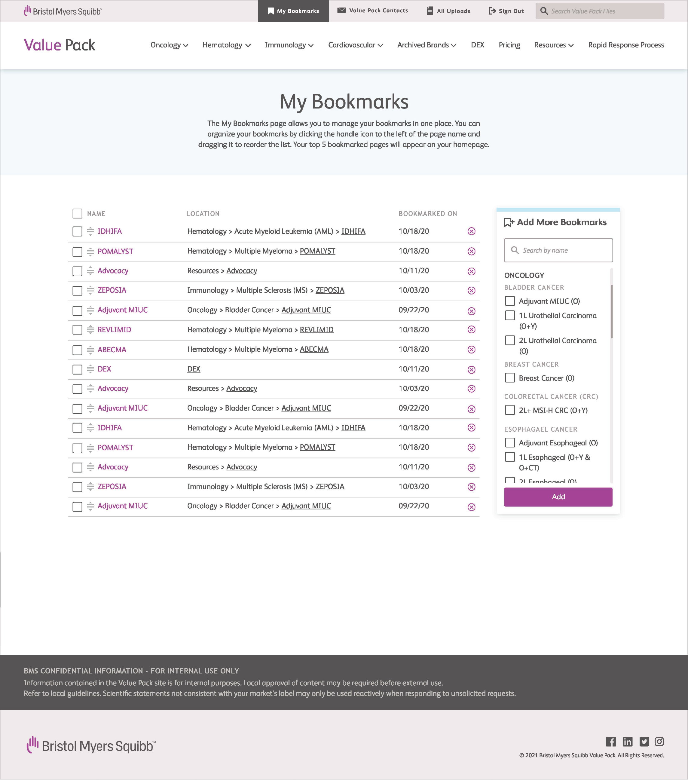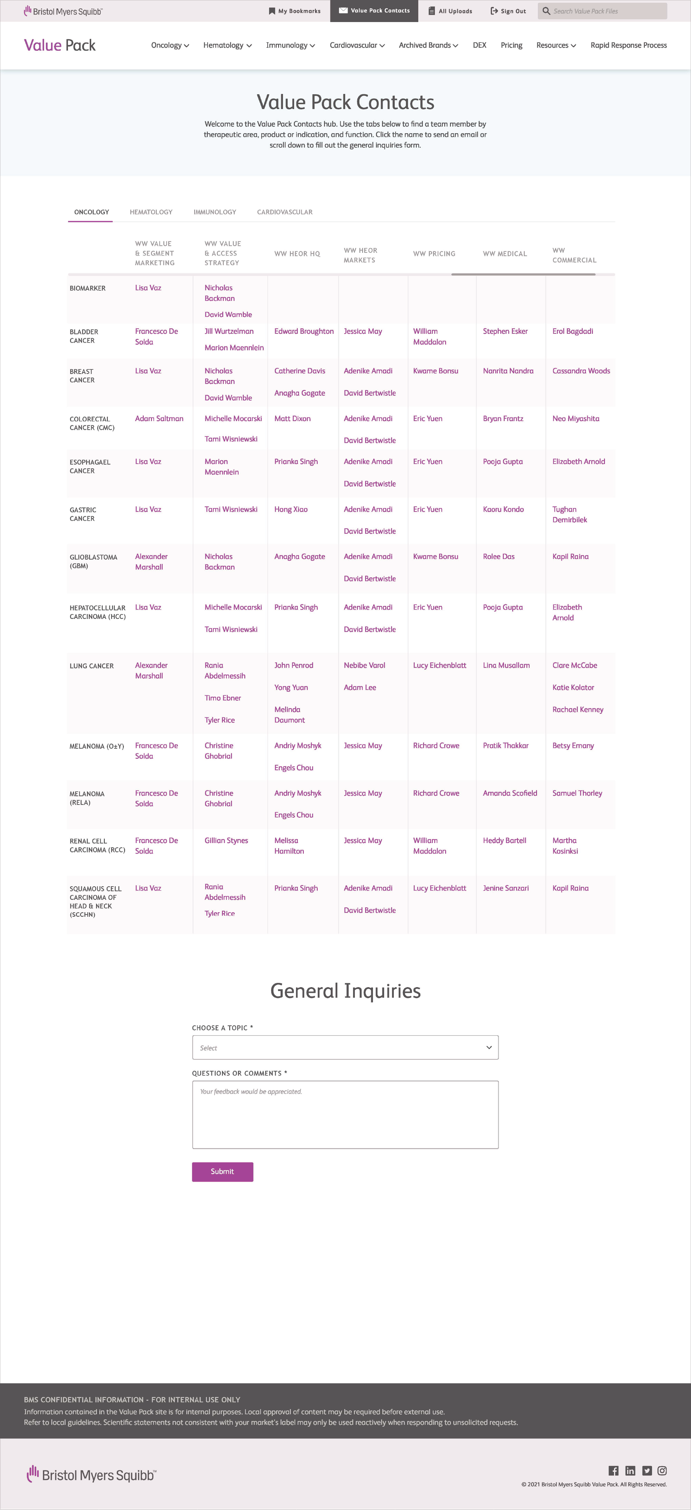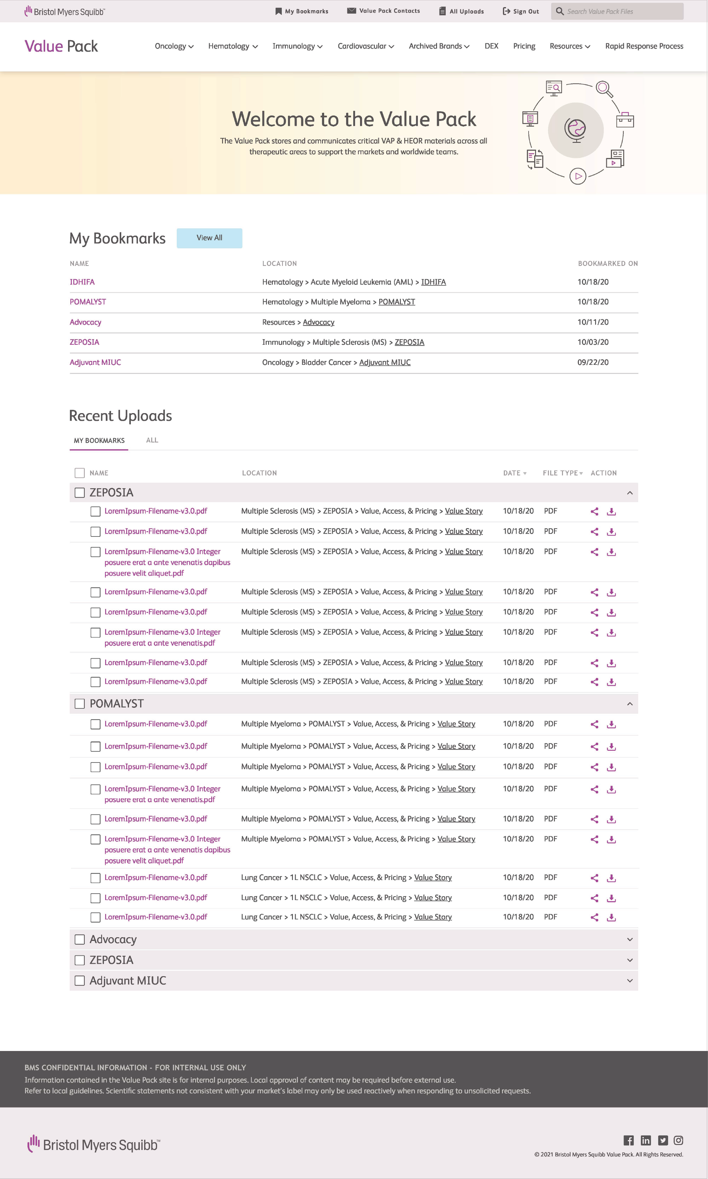 Bristol Myers Squibb is a global biopharmaceutical leader dedicated to discovering, developing, and delivering innovative medicines for serious diseases. However, VAP & HEOR materials were scattered across multiple internal platforms, making it difficult for WW teams and markets to quickly find what they needed. The Value Pack housed content for Oncology, Immunology, Cardiovascular, and Fibrosis, while the PACE Hub was used exclusively for Hematology. This fragmentation created inefficiencies, inconsistencies in communication, and a disjointed user experience across therapeutic areas.